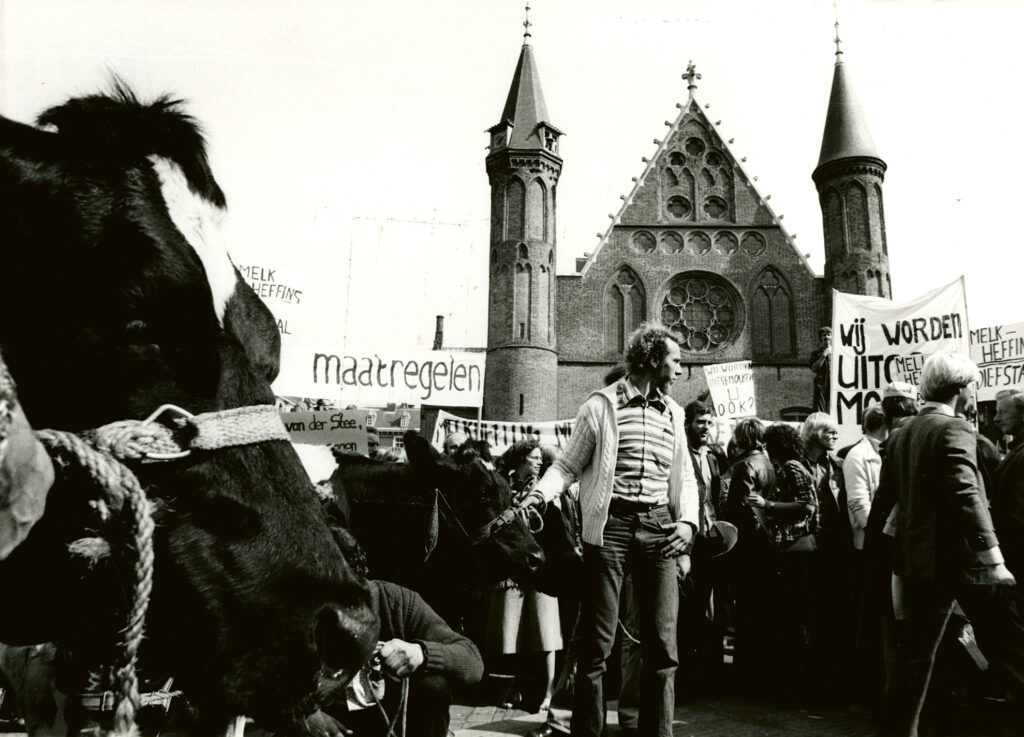 14-9-1977 – Leden van de werkgroep Beter Zuivelbeleid en die van het Agrarisch Jongerencontact demonstreren tegen de heffing van 89 ct. per liter melk, die de EEG per 16 september 1977 de boeren gaat opleggen. Binnenhof. Fotograaf · Fotobureau Stokvis (Meyer). Collectie · Haags Gemeentearchief.